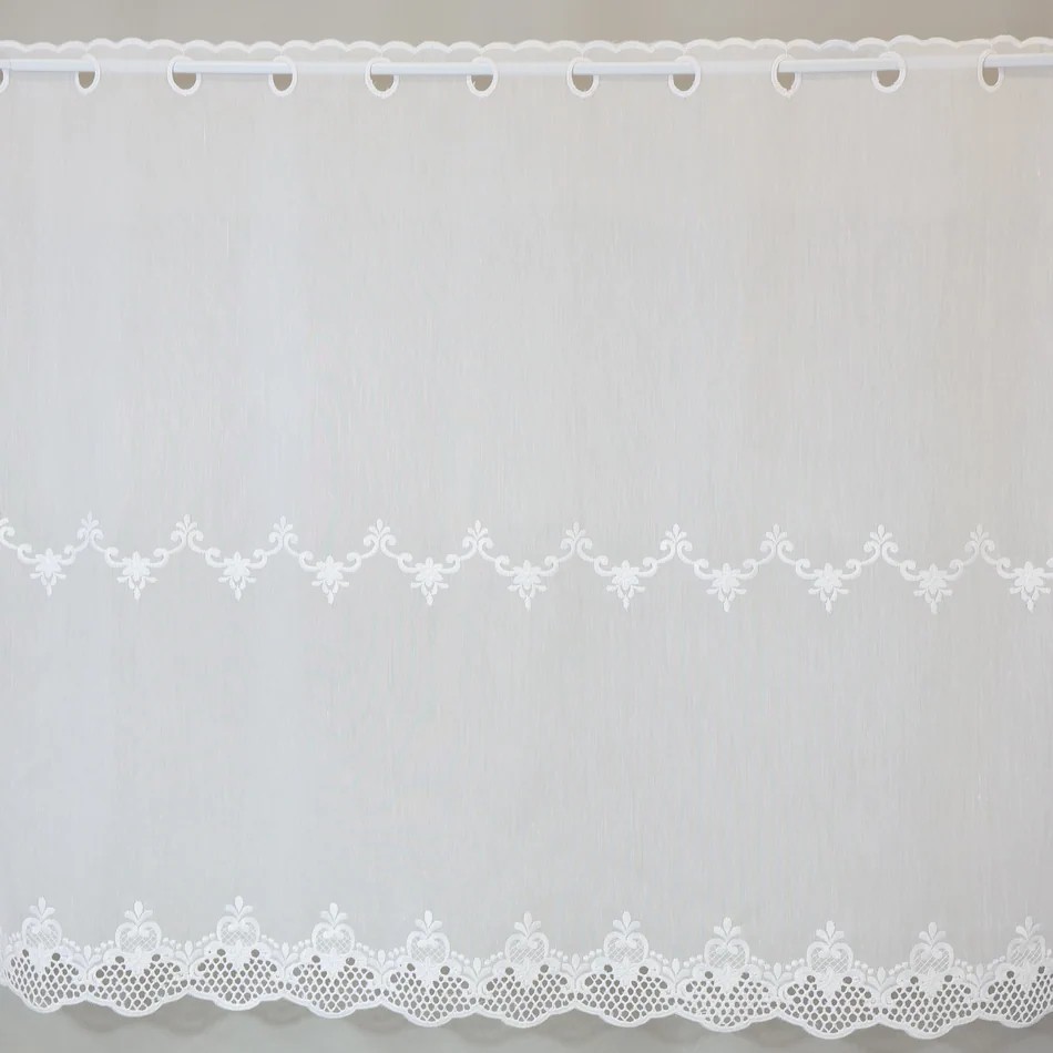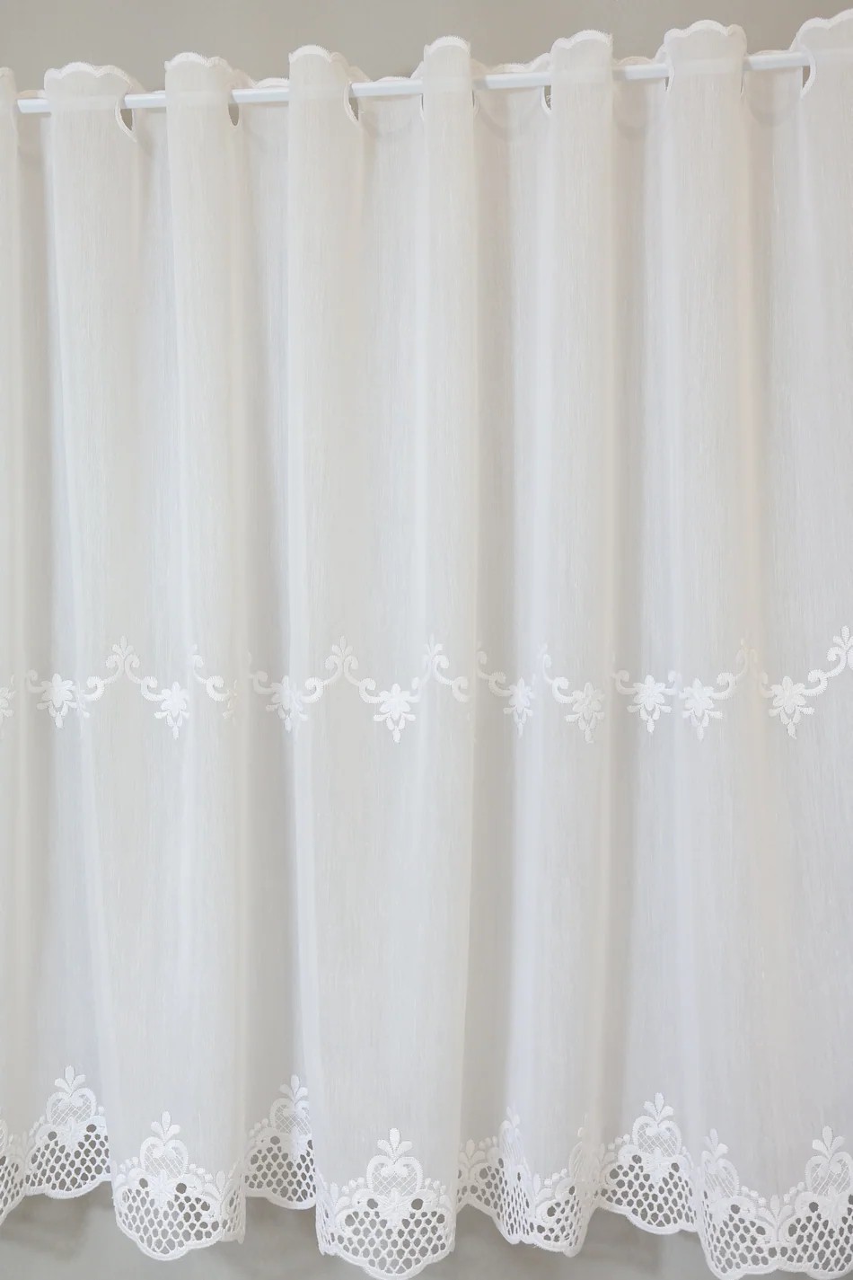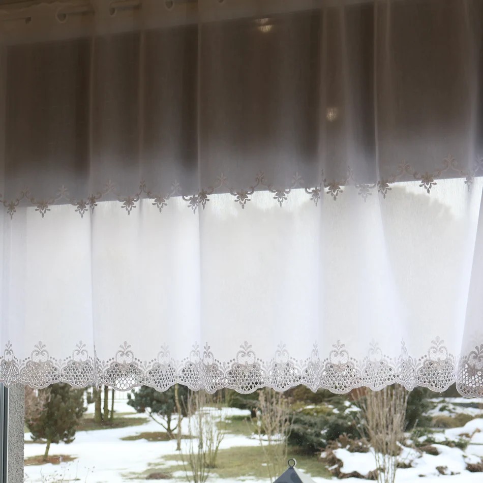 • Biała tkanina z ozdobnym haftem, imitacja płótna