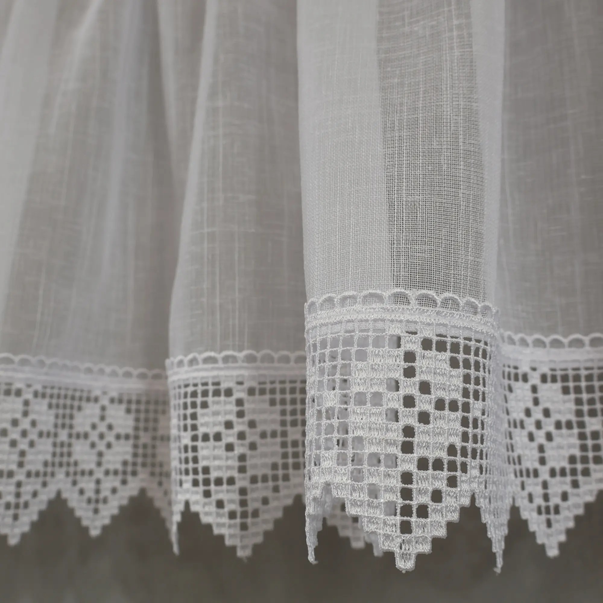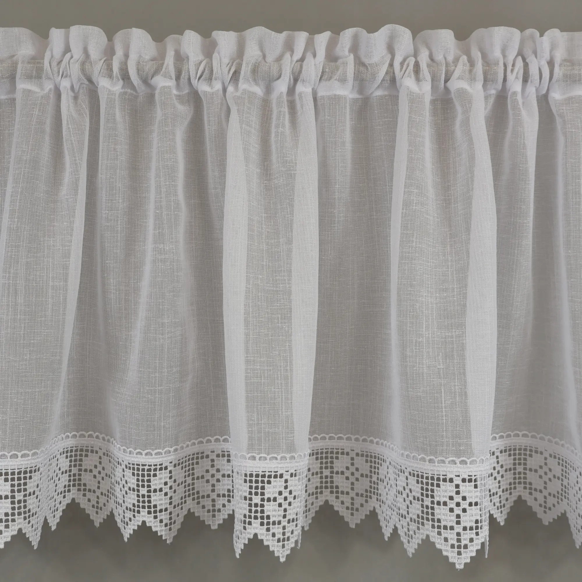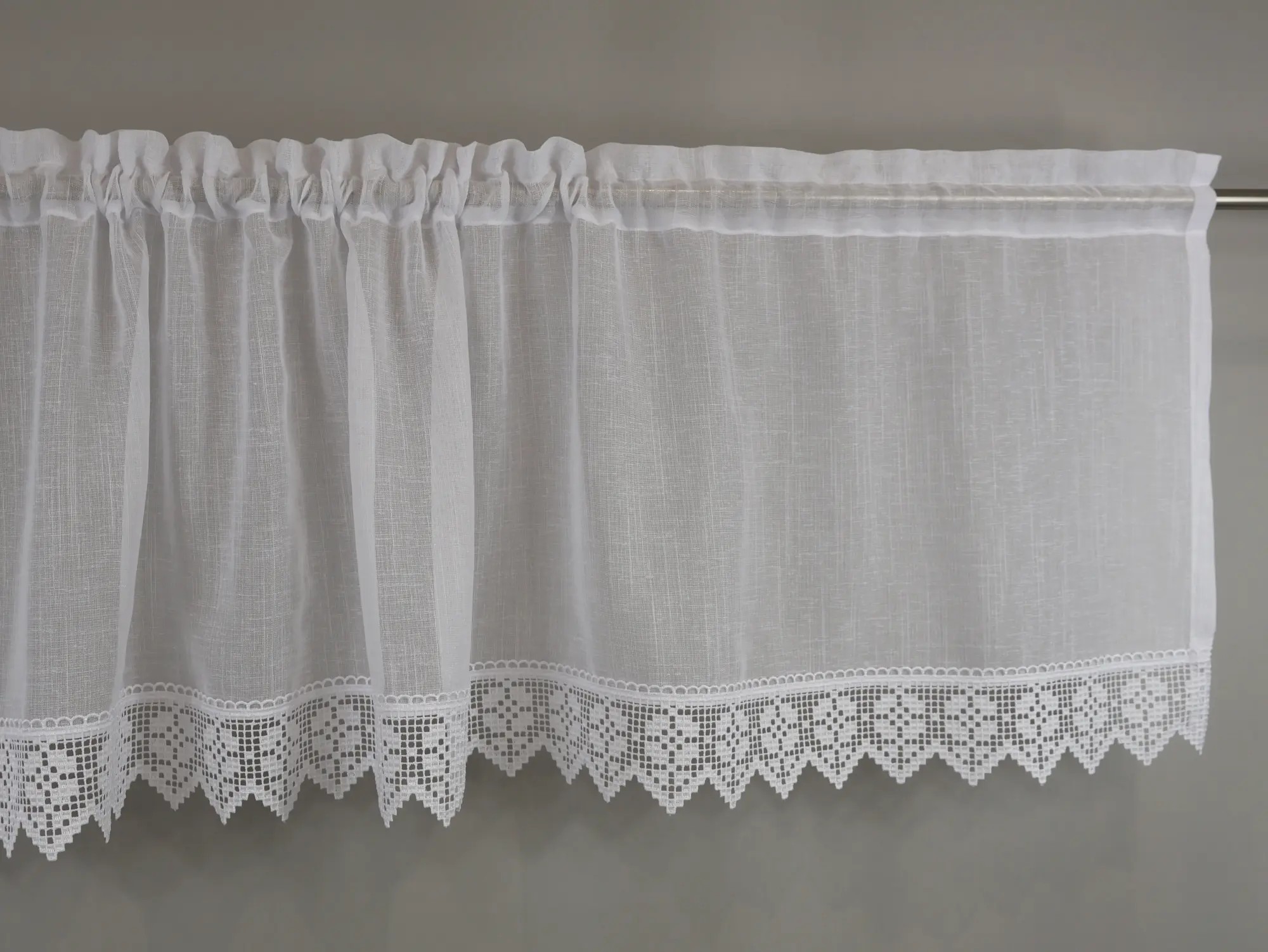 Biała zazdrostka do kuchni z dekoracyjną gipiurą to ponadczasowa firana, która subtelnie zdobi okno i pięknie przepuszcza światło. Doskonale sprawdzi się w kuchniach klasycznych, rustykalnych i tradycyjnych, wprowadzając lekkość, elegancję oraz przytulny klimat.
