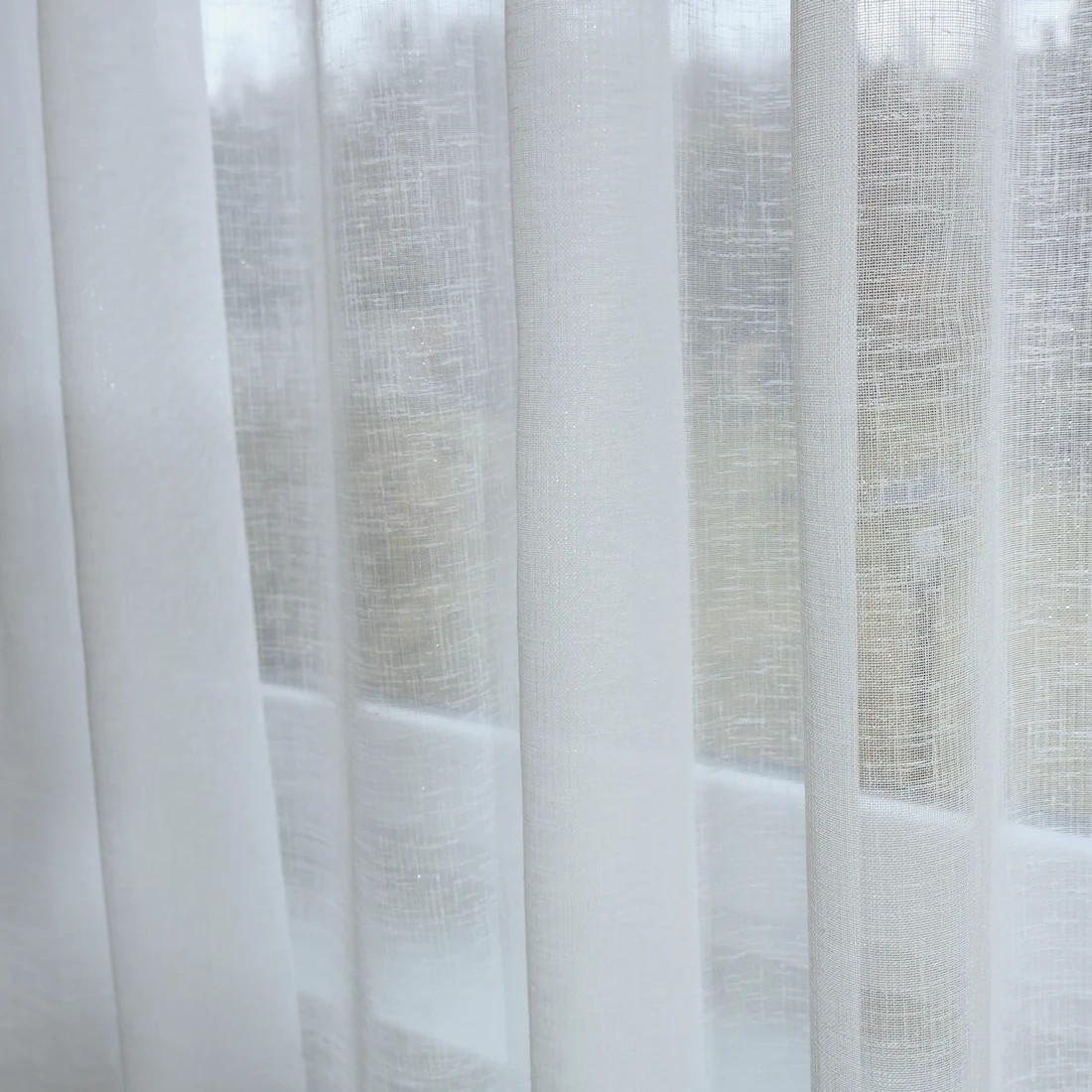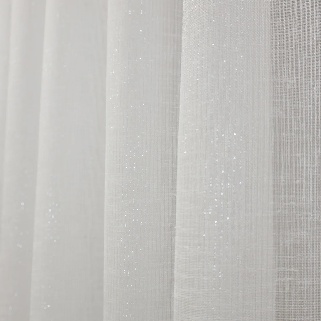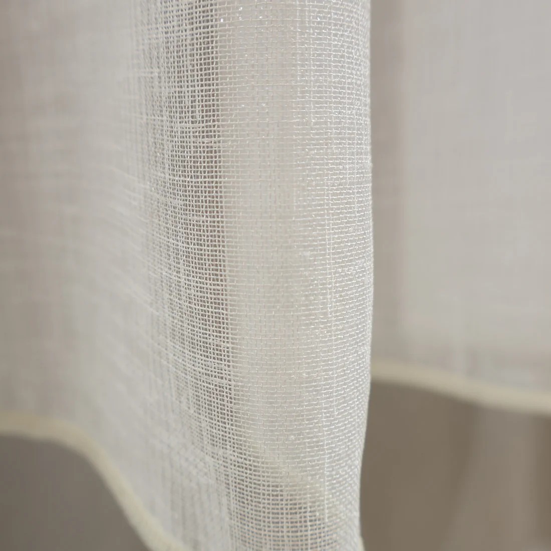 Prosta firana z połyskiem w odcieniu śmietankowo-kremowym to lekka, lejąca firana na wymiar, która subtelnie podkreśla dekorację okna w salonie, sypialni lub przy tarasie, pięknie filtrując światło i dodając wnętrzu klasy. Idealna do nowoczesnych, pastelowych lub eleganckich aranżacji, łącząca delikatny blask z funkcjonalnością i subtelnym designem.