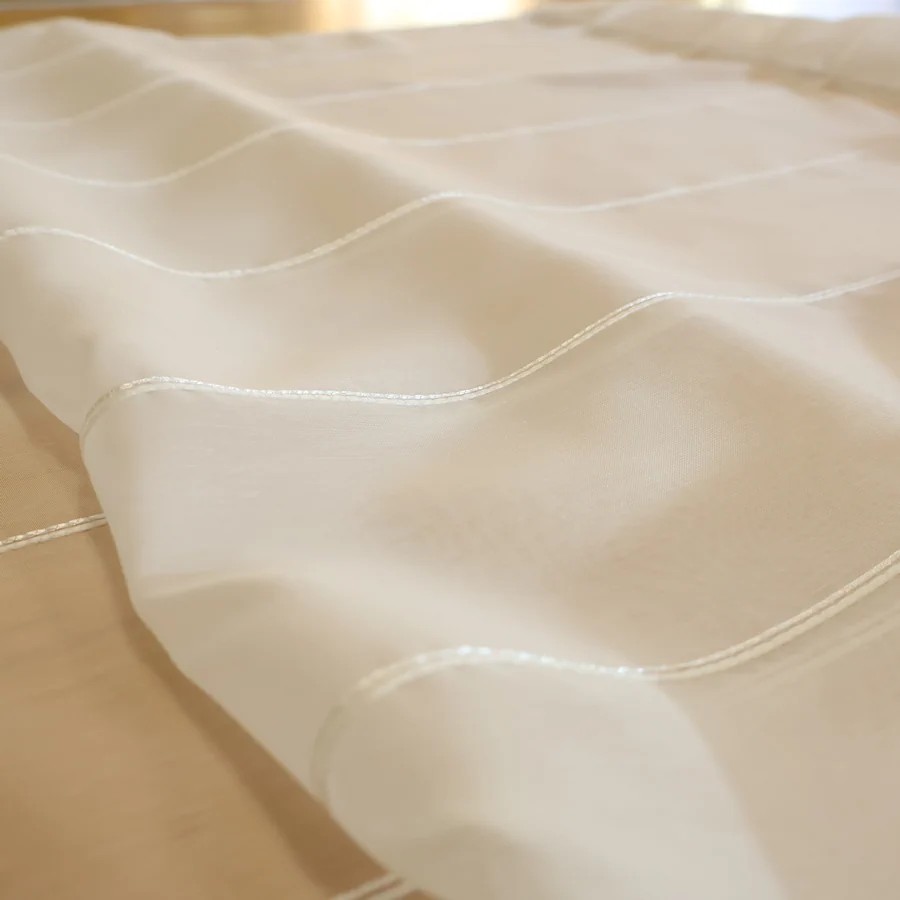 - Tkanina dekoracyjna w kolorze kremowym, delikatnie mieniące się pionowe paseczki