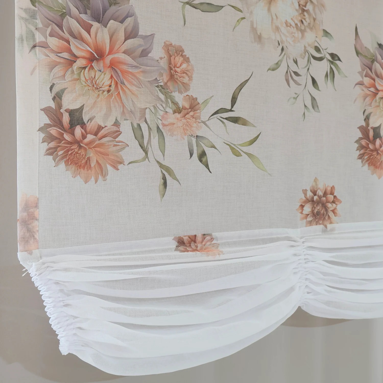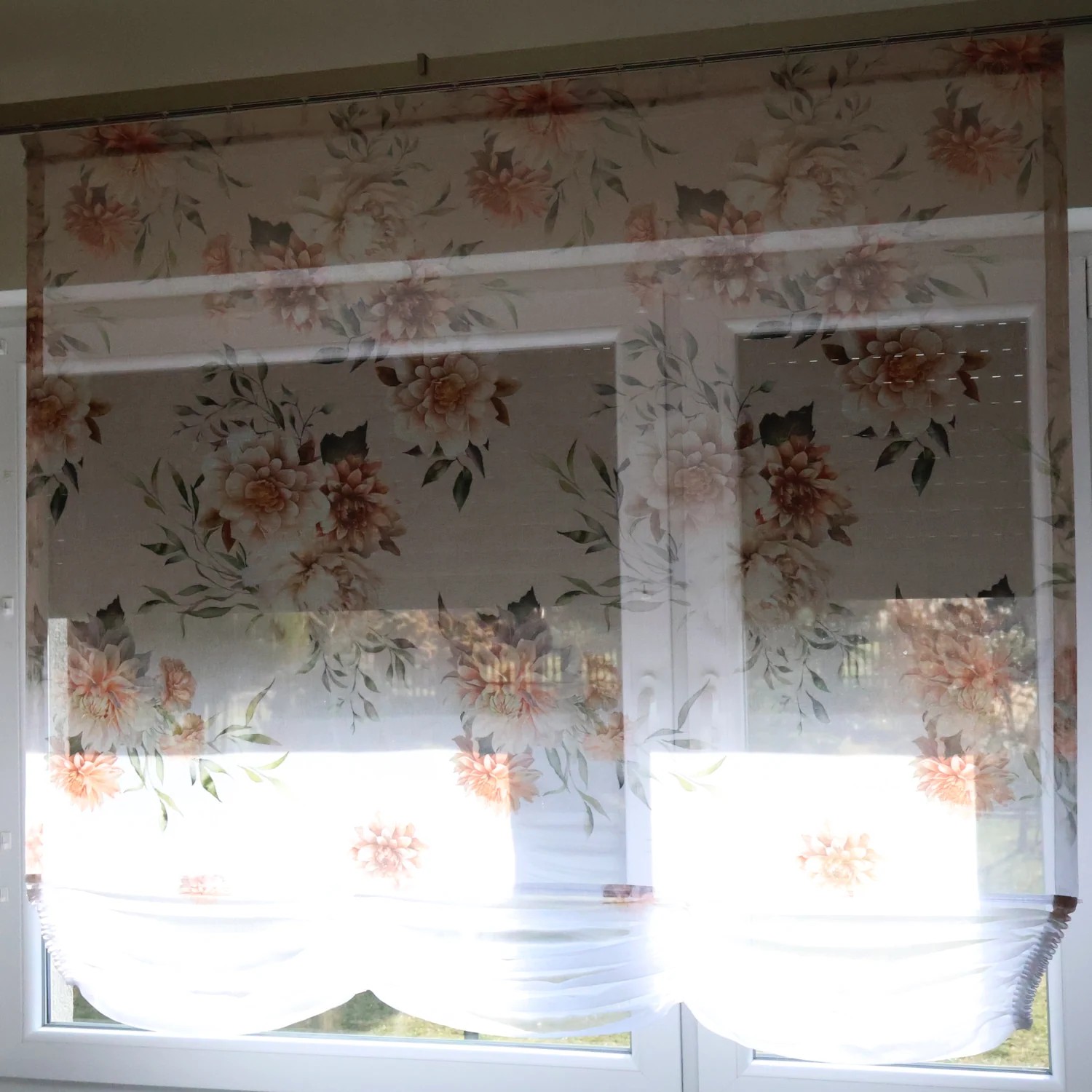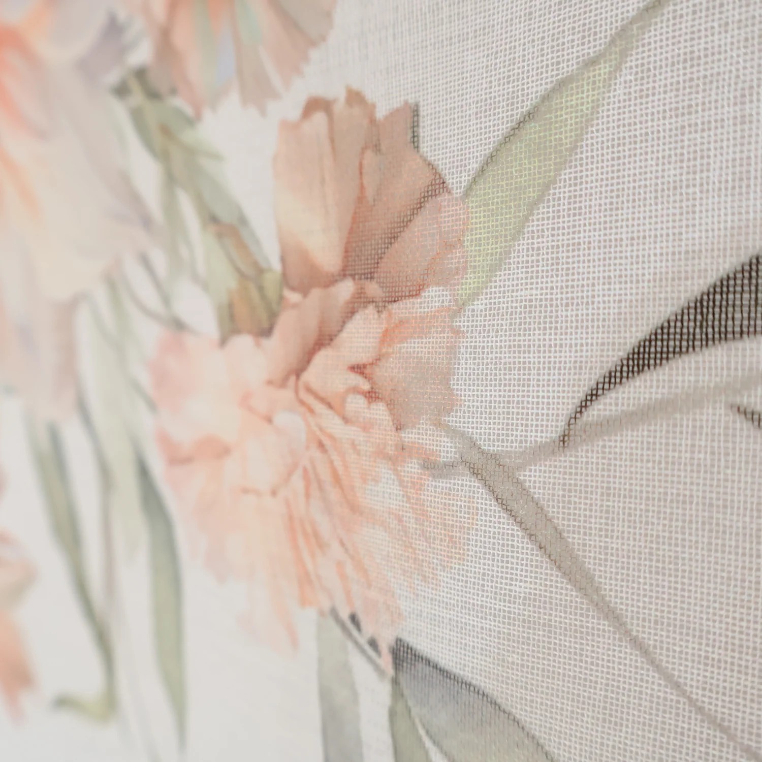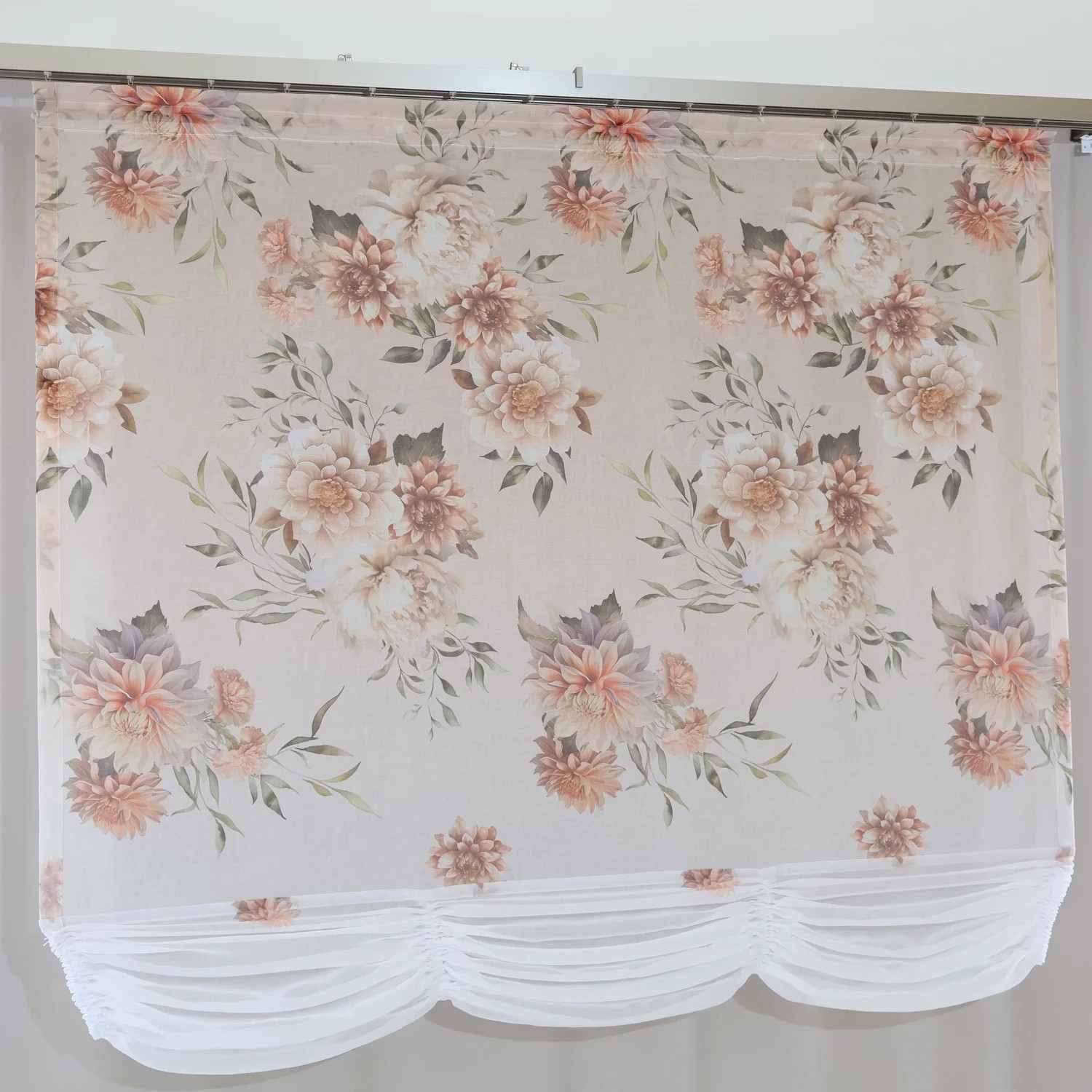 - Tkanina dekoracyjna o biało beżowym podkładzie, cieniowana, dobrze przepuszczająca światło, wzór kwiaty