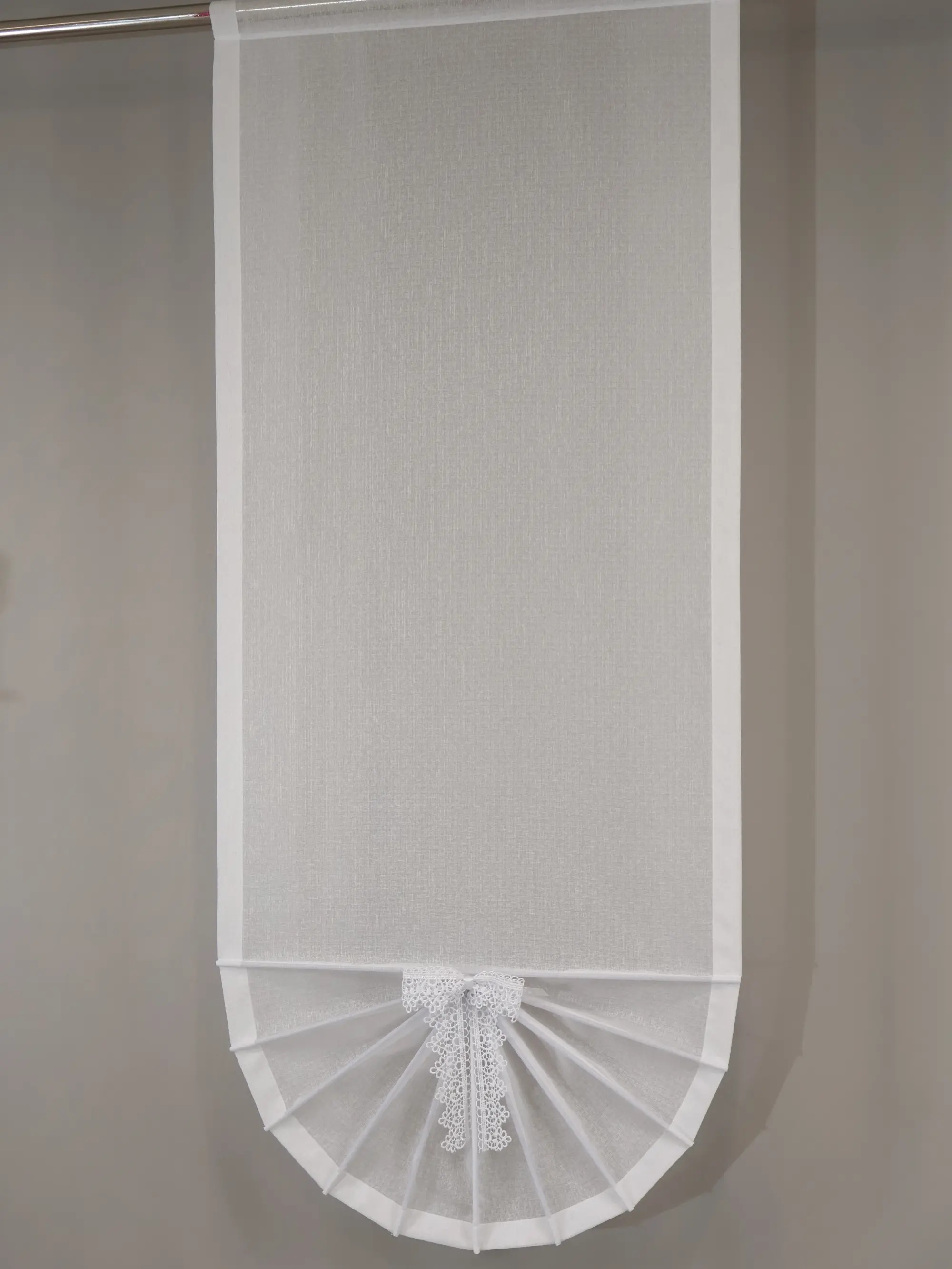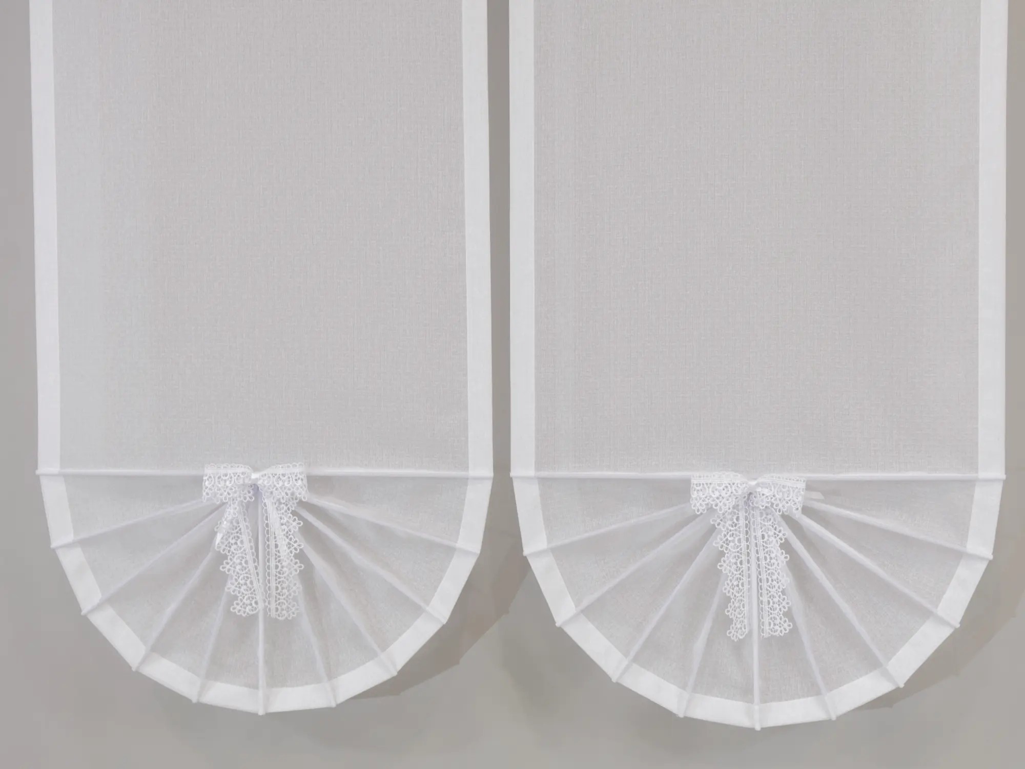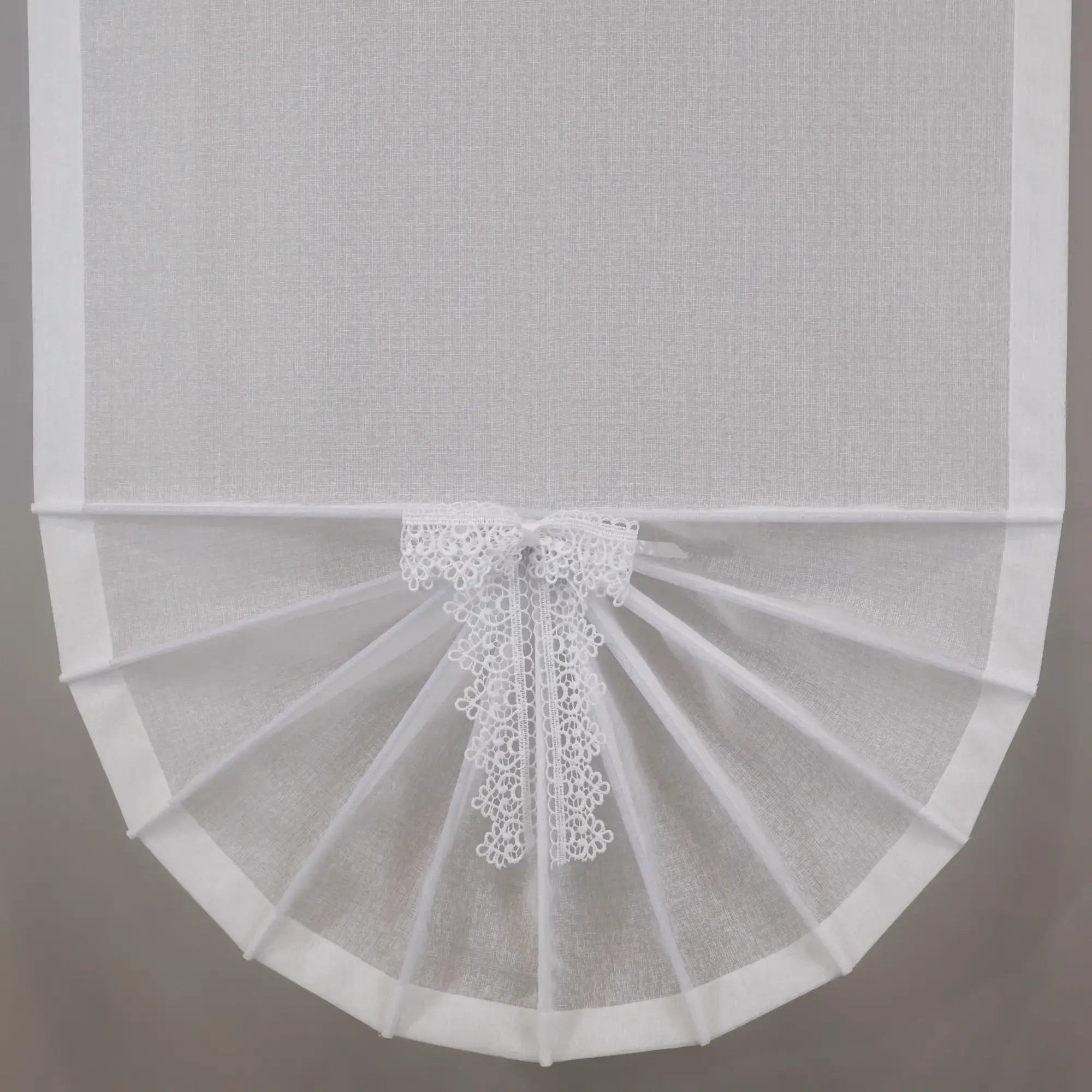 Biała firana panelowa w formie wachlarza z tkaniny woal sable to subtelna i stylowa ozdoba okna. Doskonale rozświetla wnętrze i dodaje mu elegancji.