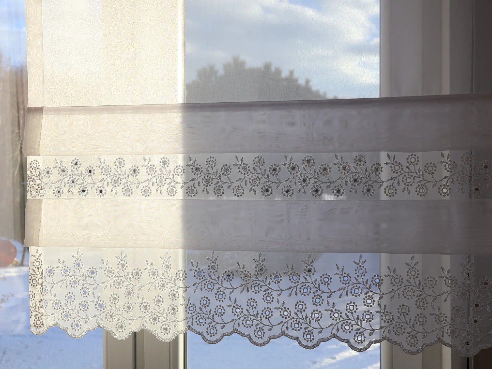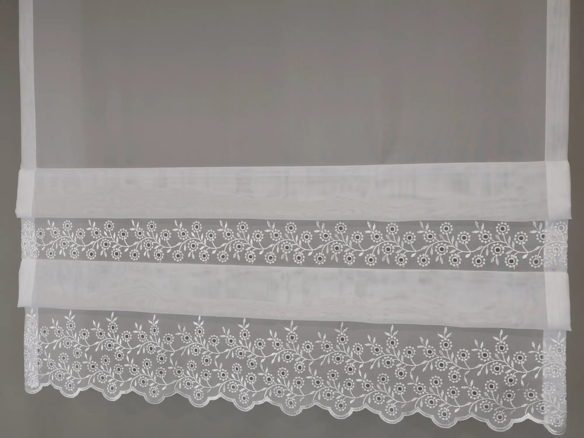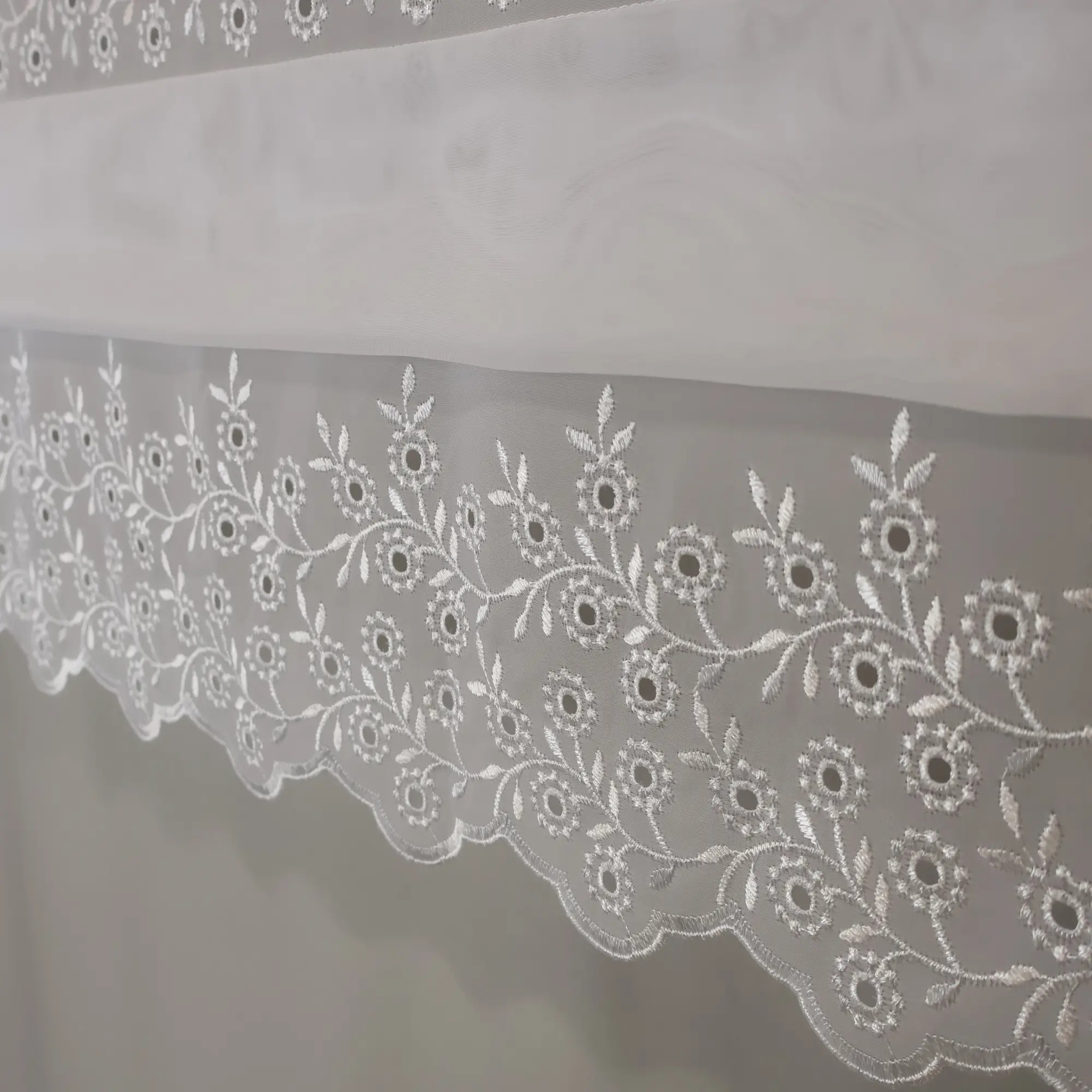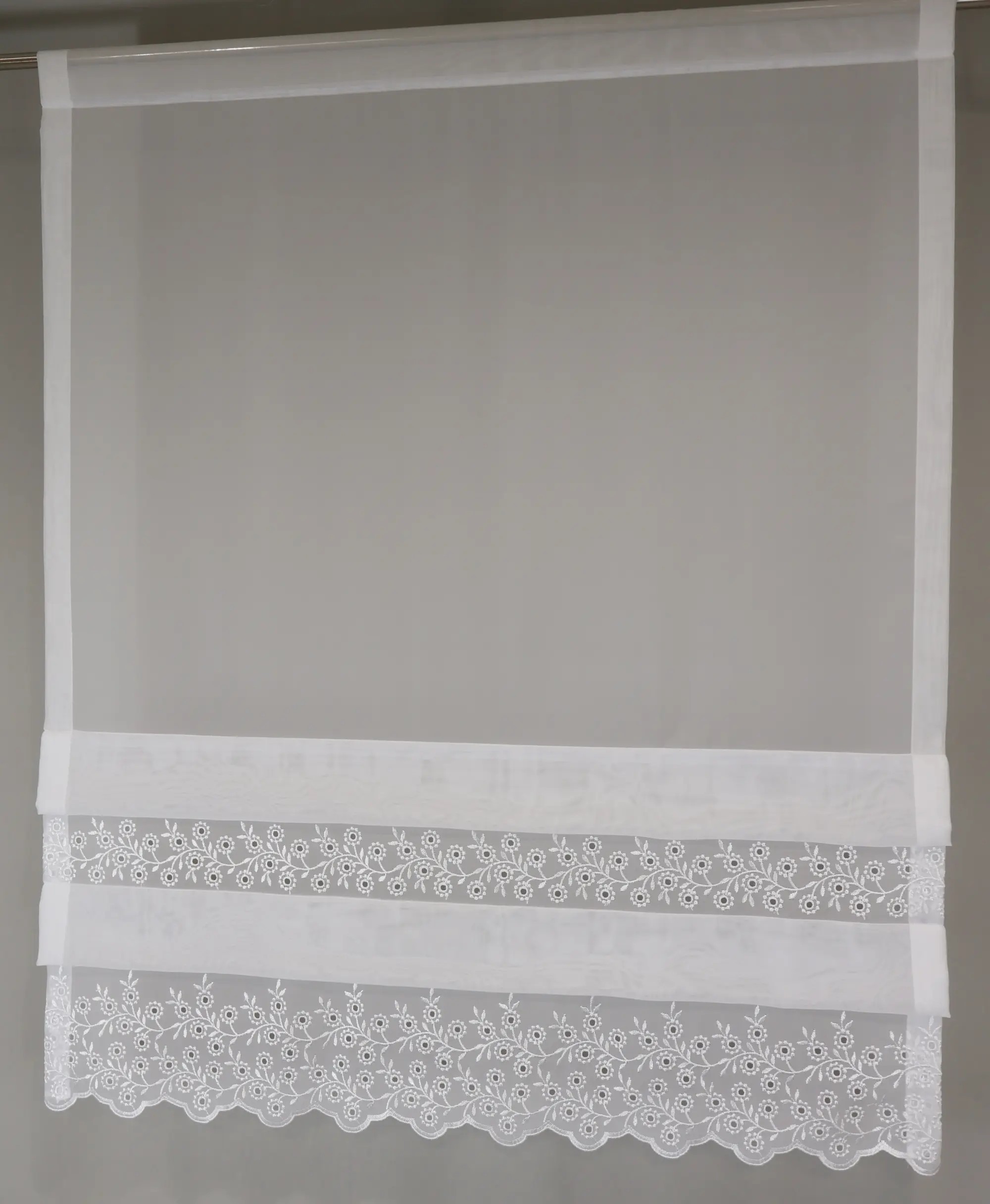 Firana panelowa z delikatnego woalu, ozdobiona dekoracyjnym haftem i zakładkami, tworzy elegancką i harmonijną oprawę okna. Idealna do jasnych, klasycznych i nowoczesnych wnętrz.