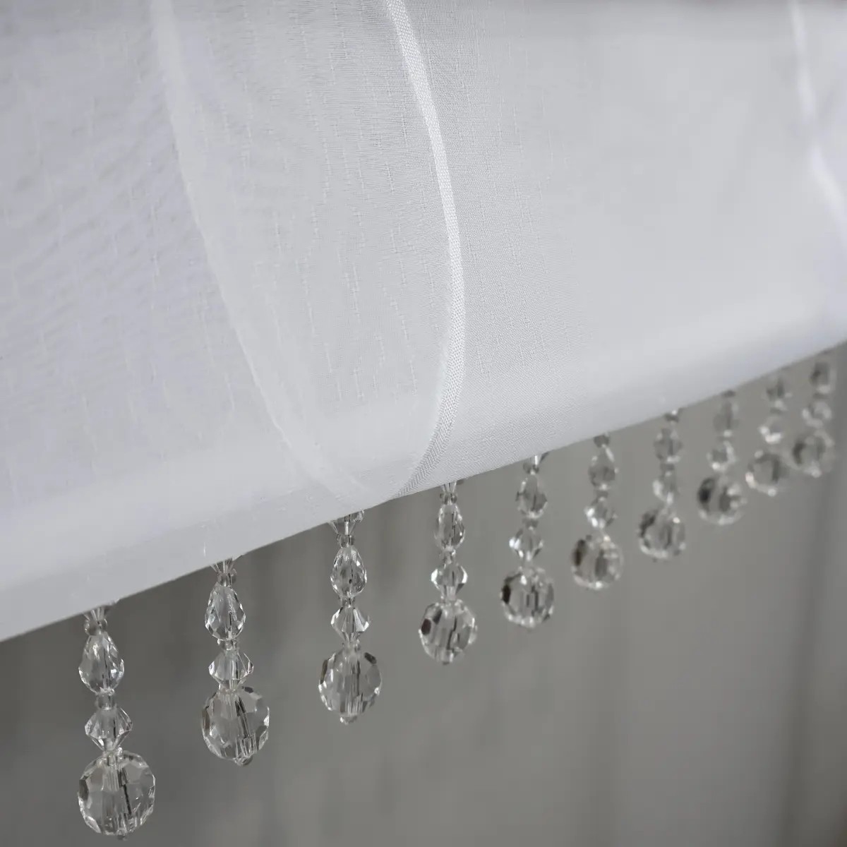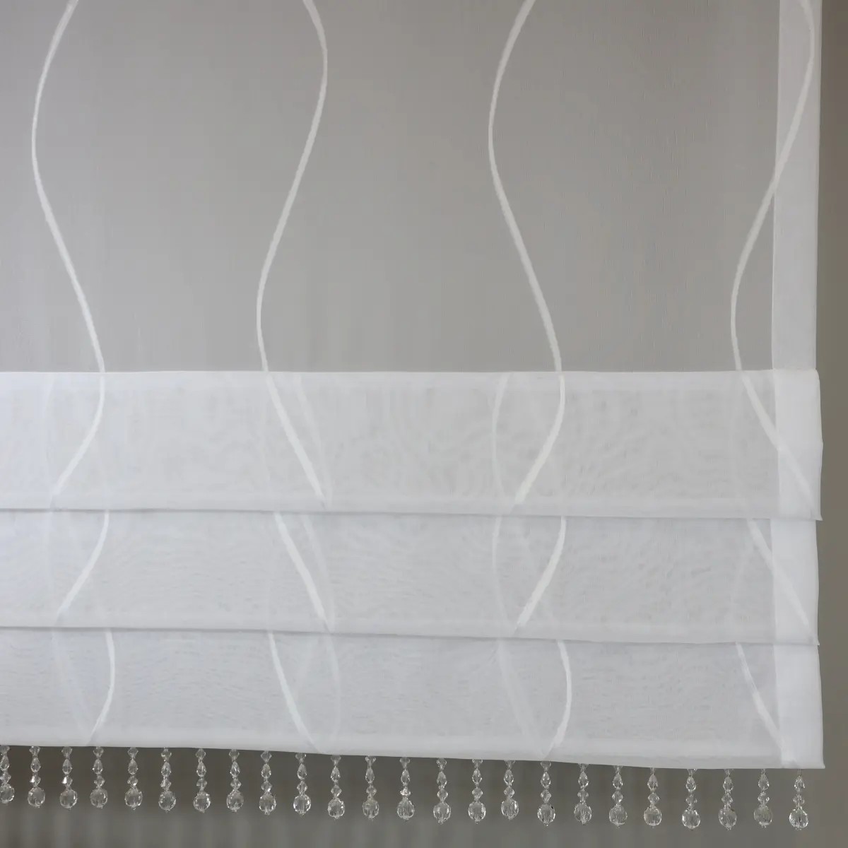 Biała firana panelowa w formie roletki to połączenie lekkości i subtelnej dekoracji. Delikatny wzór fali nadaje tkaninie miękkiego charakteru, a koraliki przy dolnej krawędzi wprowadzają elegancki, świetlisty akcent.