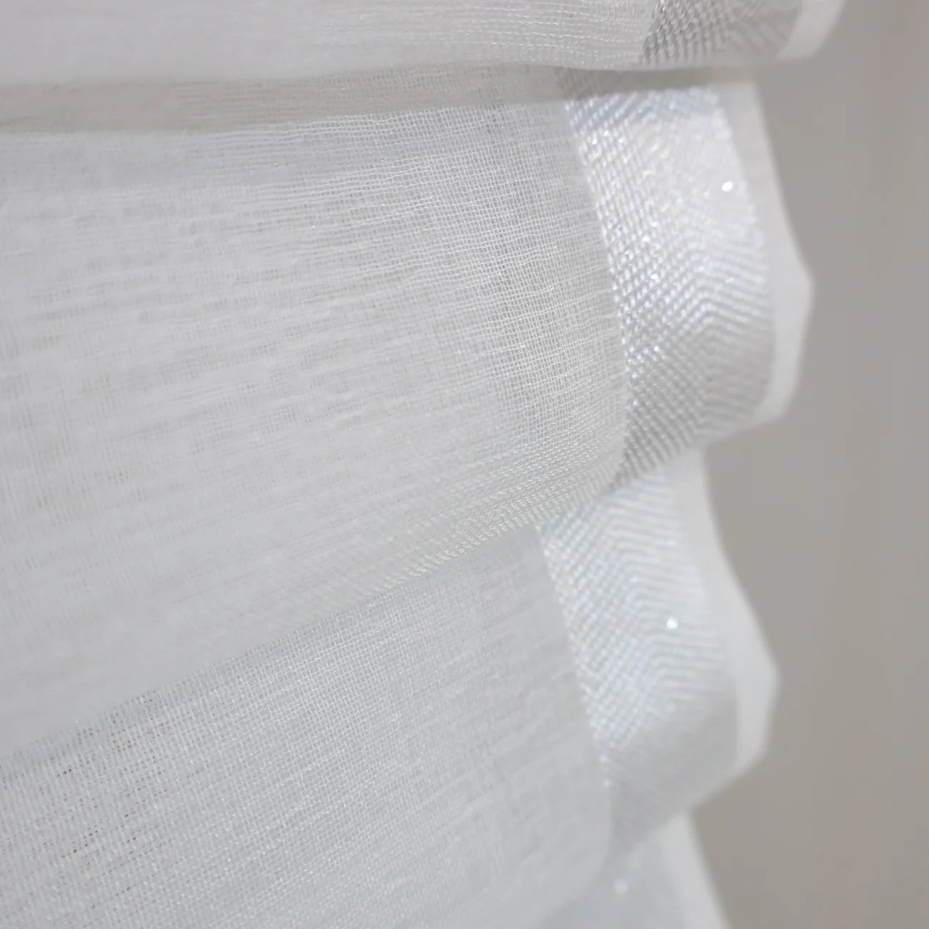 - Tkanina fantazyjna w pionowe pasy, strukturą imituje splot lnu z błyszczącymi srebrnymi nitkami, kolor biały