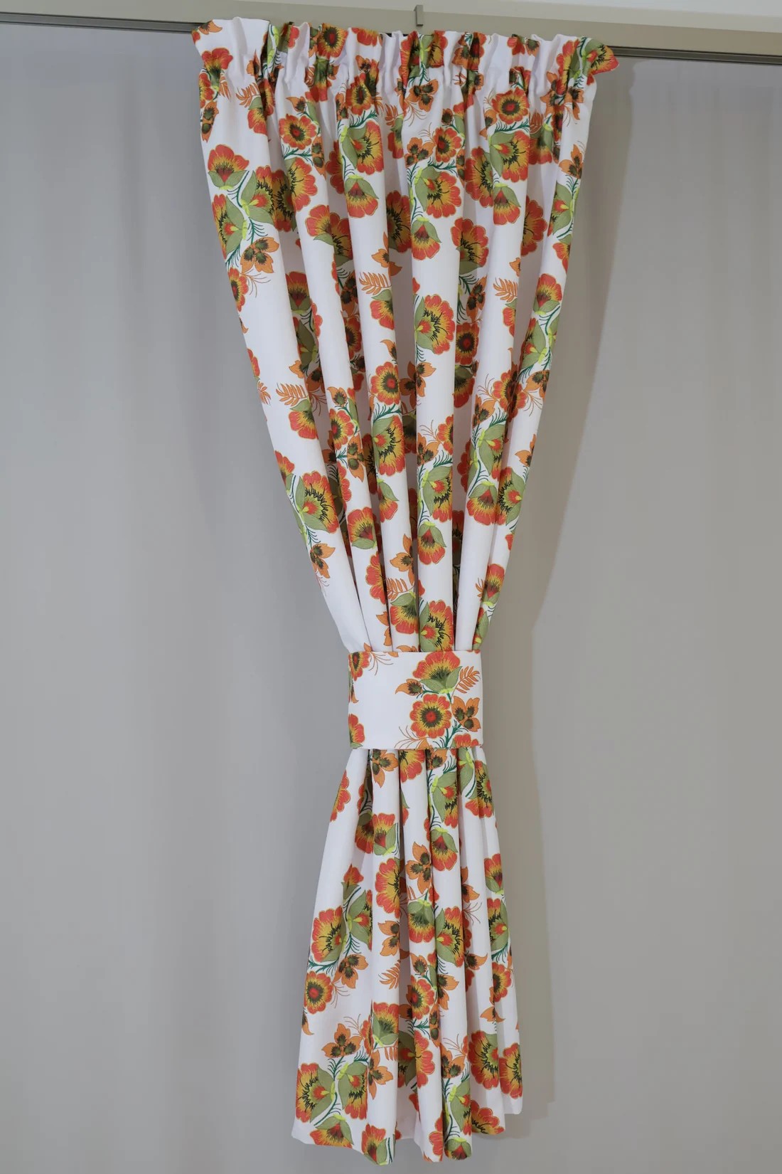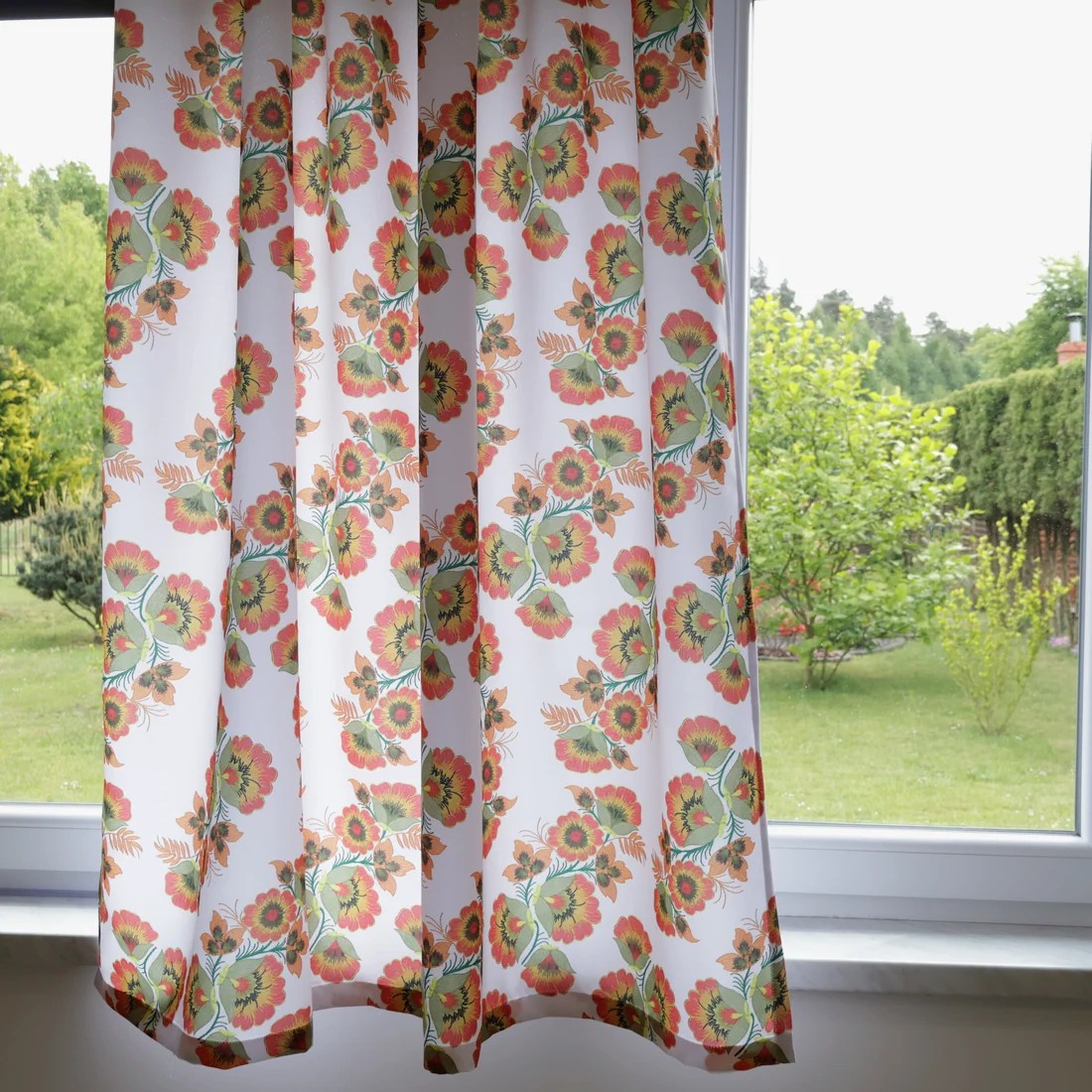 Kolorowa zasłona w stylu ludowym z kwiatowym wzorem inspirowanym folklorem. Ożywia wnętrze i nadaje mu ciepły, tradycyjny charakter.