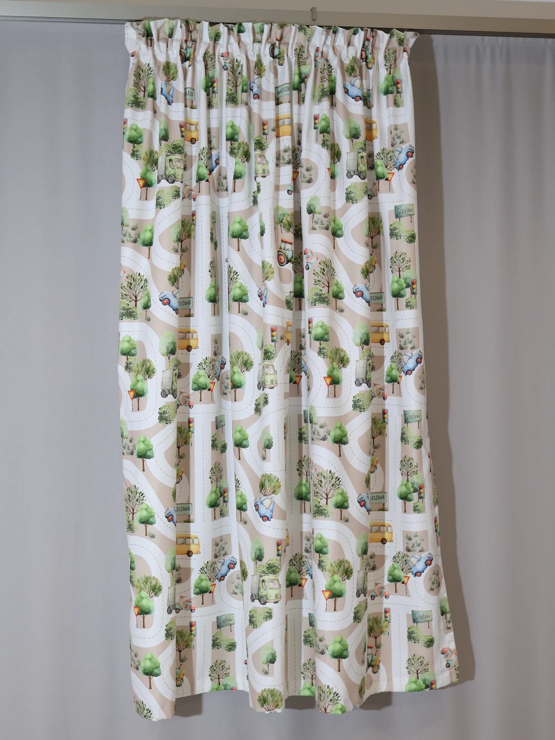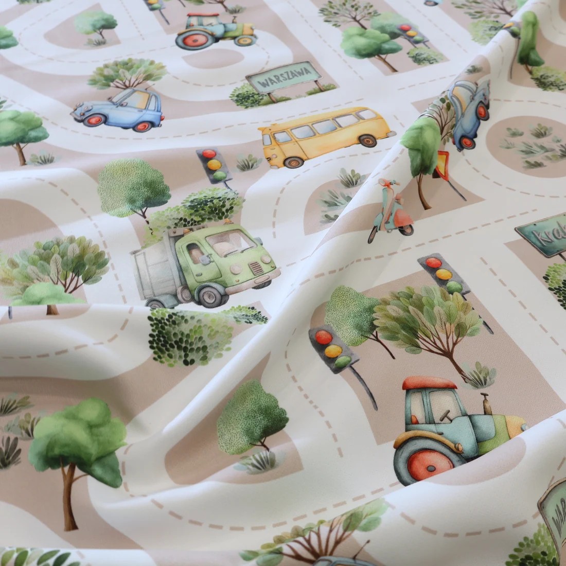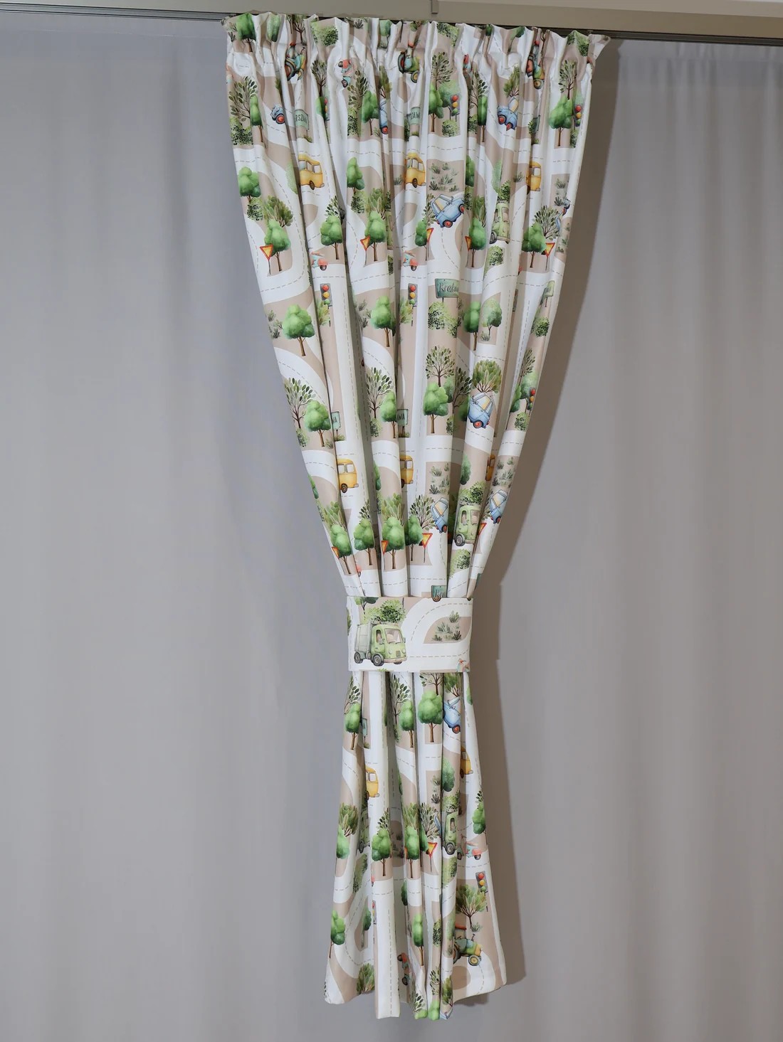 Zasłona dziecięca w pojazdy i traktory – tkanina dekoracyjna na blado-kremowym tle z jednostronnym nadrukiem. Wykończenie oraz sposób powieszenia do wyboru