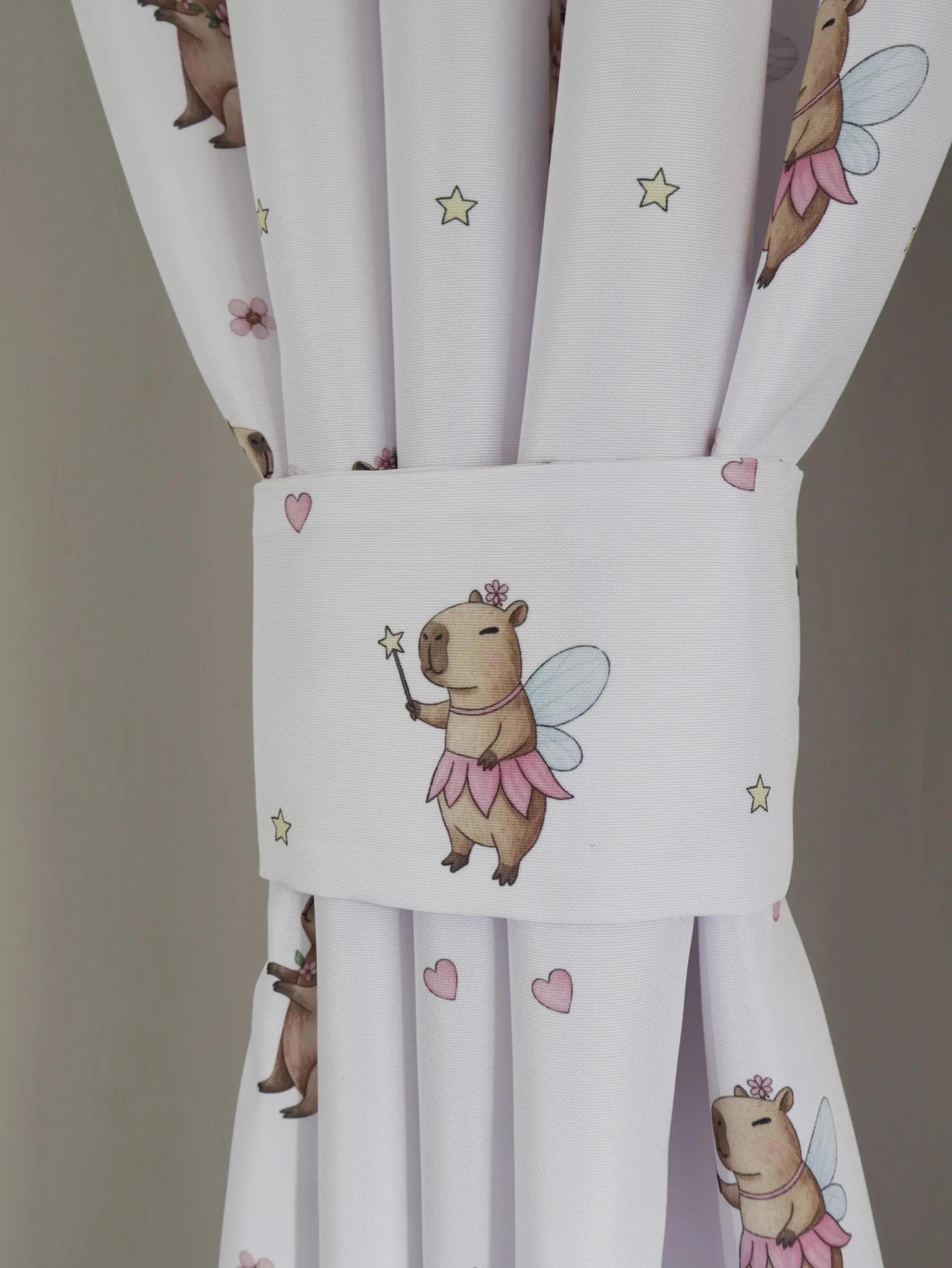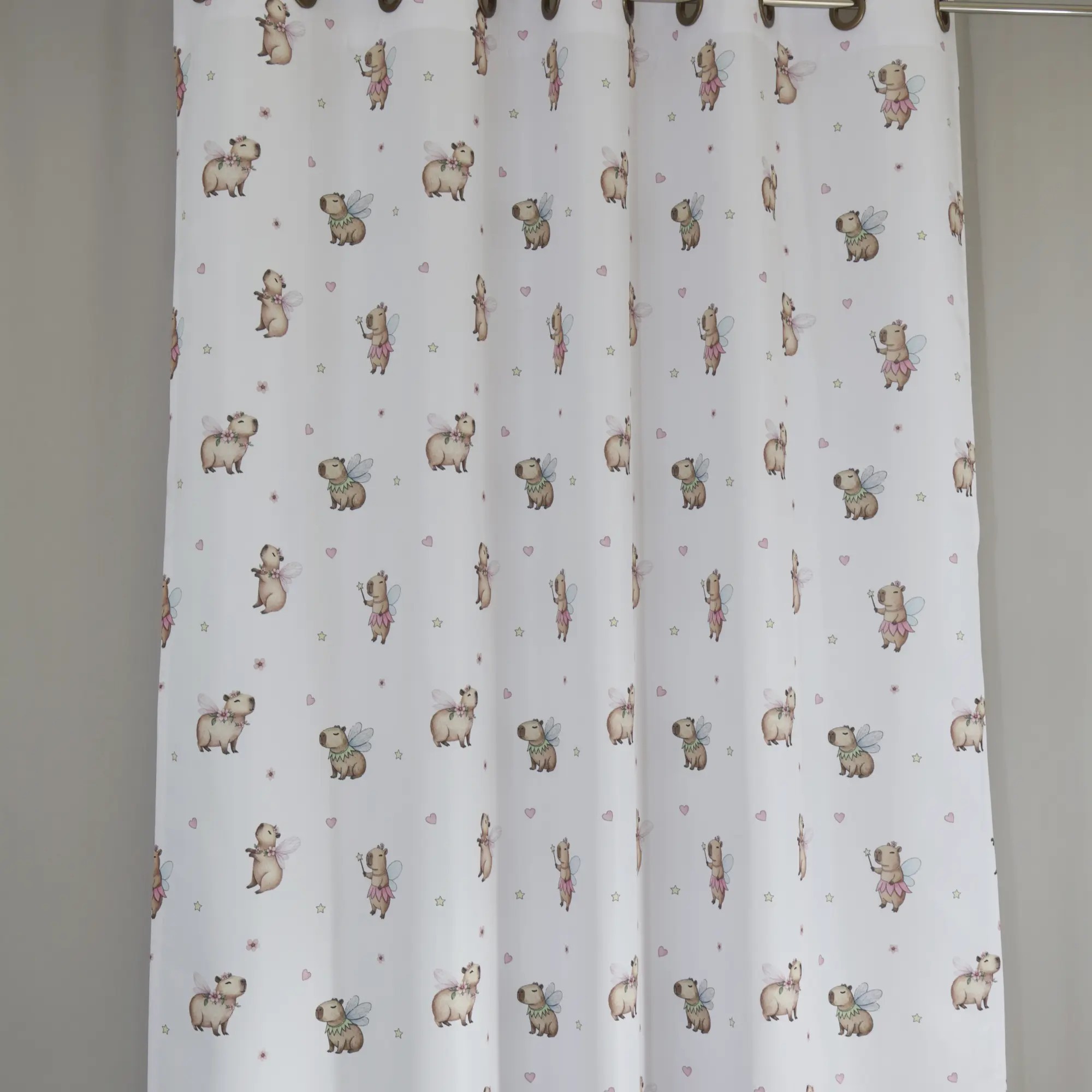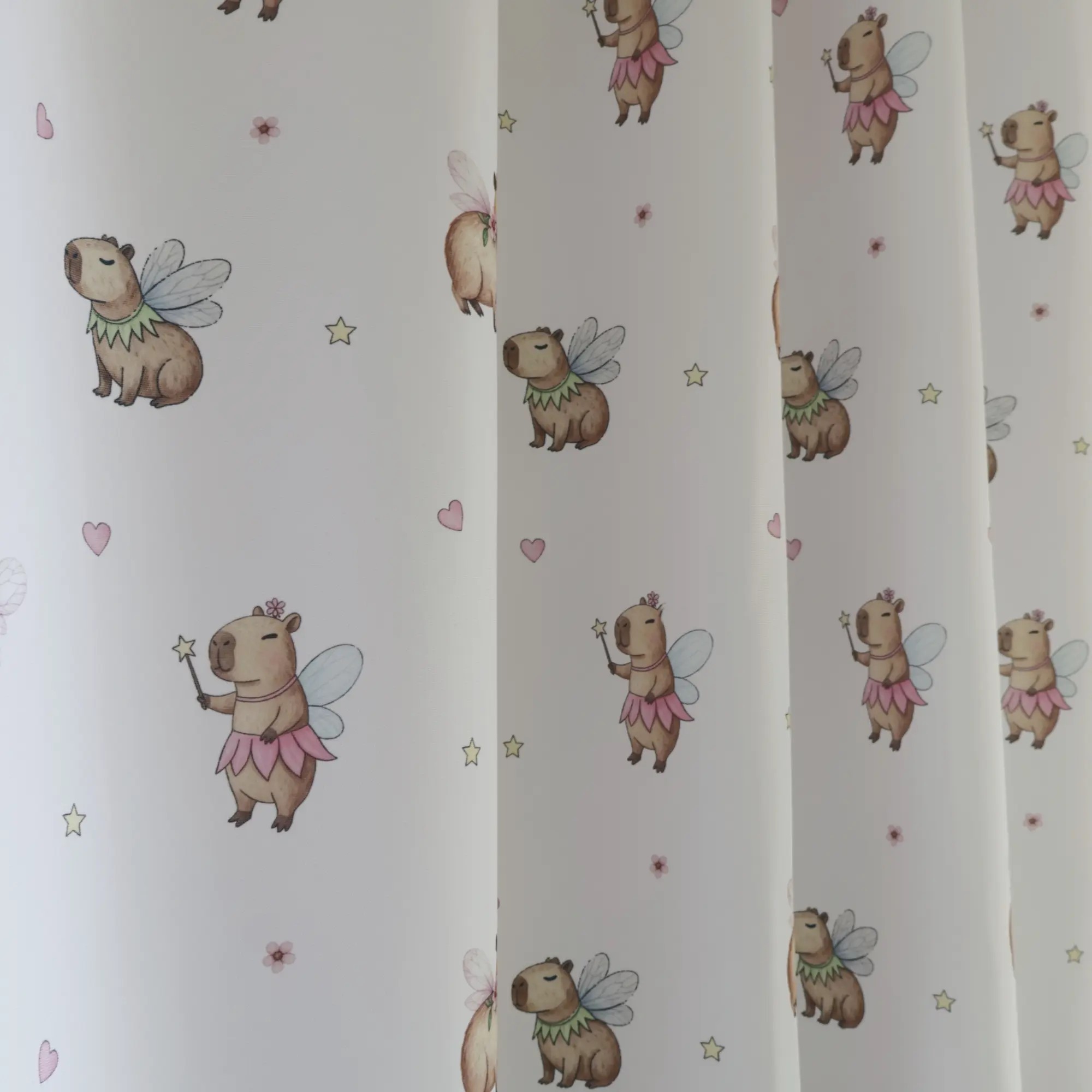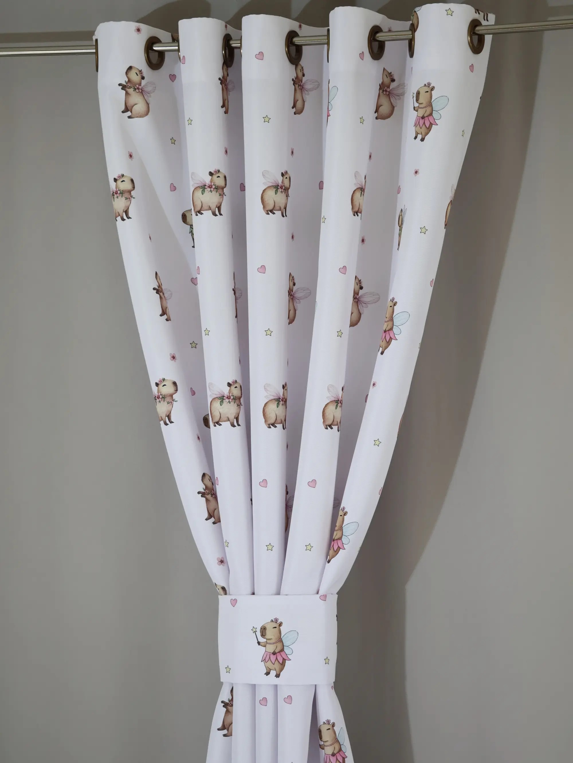Zasłona do pokoju dziecka z uroczym motywem kapibar to wyjątkowa dekoracja, która wprowadza do wnętrza bajkowy i ciepły klimat. Delikatny nadruk zwierzątek z subtelnymi detalami doskonale sprawdzi się w pokoju dziewczynki lub malucha. Szycie na wymiar pozwala idealnie dopasować zasłonę do okna, tworząc przytulną i bezpieczną przestrzeń.